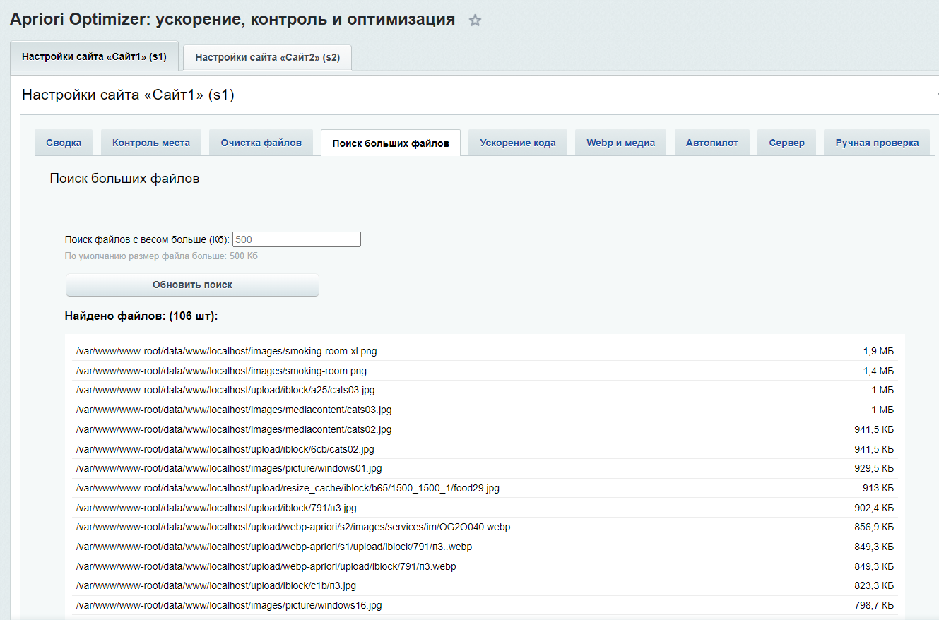 Поиск больших файлов. Такие файлы могут мешать быстрой загрузке страниц и, как следствие, SEO оптимизации.