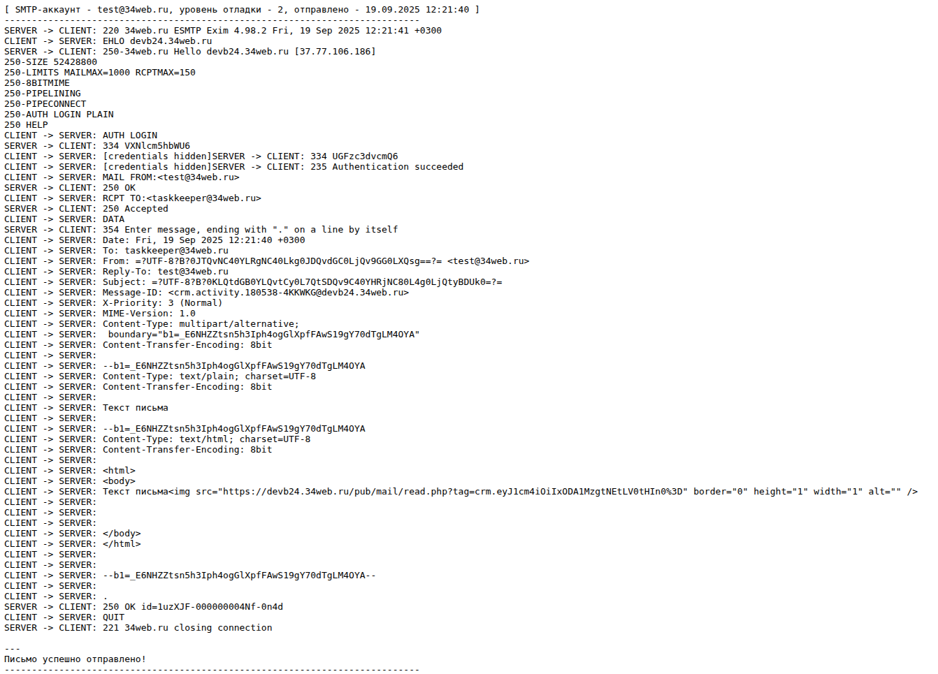 Для обеспечения приватности писем настоятельно рекомендуется отключить функционал логирования писем, если не требуется диагностика проблем отправки почты!