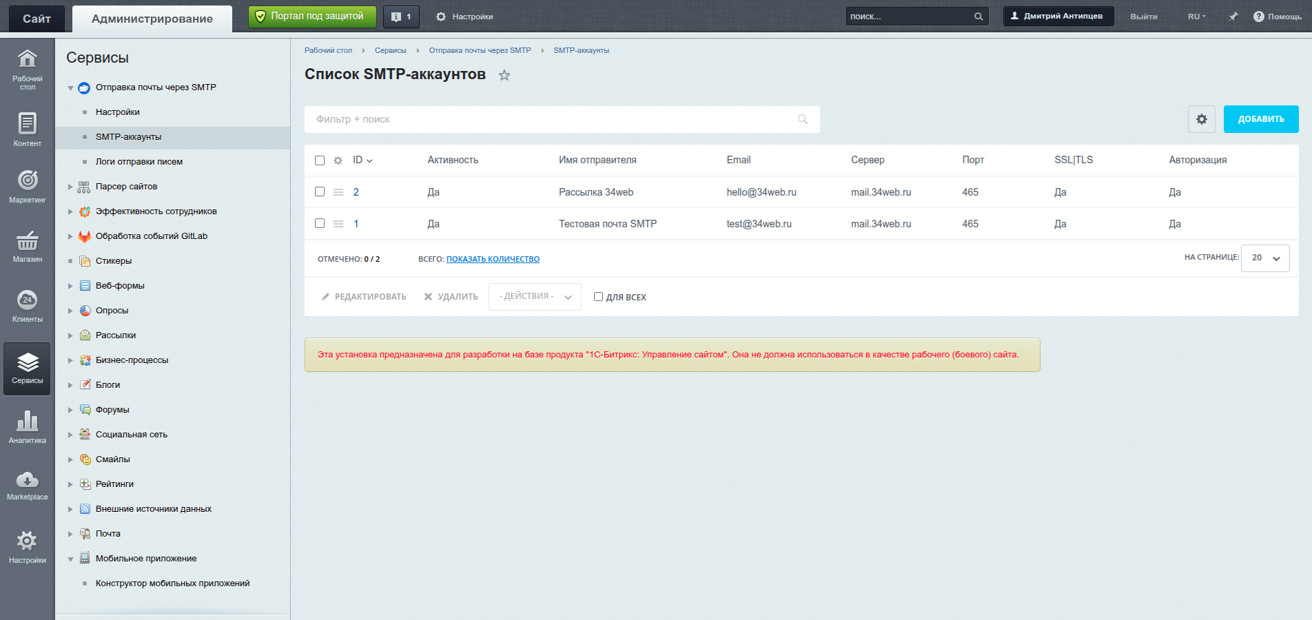 Для создания SMTP-аккаунтов необходимо выполнить переход в раздел "Сервисы → Отправка почты через SMTP → SMTP-аккаунты" и указать данные для отправки. При сохранении аккаунта выполняется проверка соединения, потому если данные не верны, то они не будут сохранены.