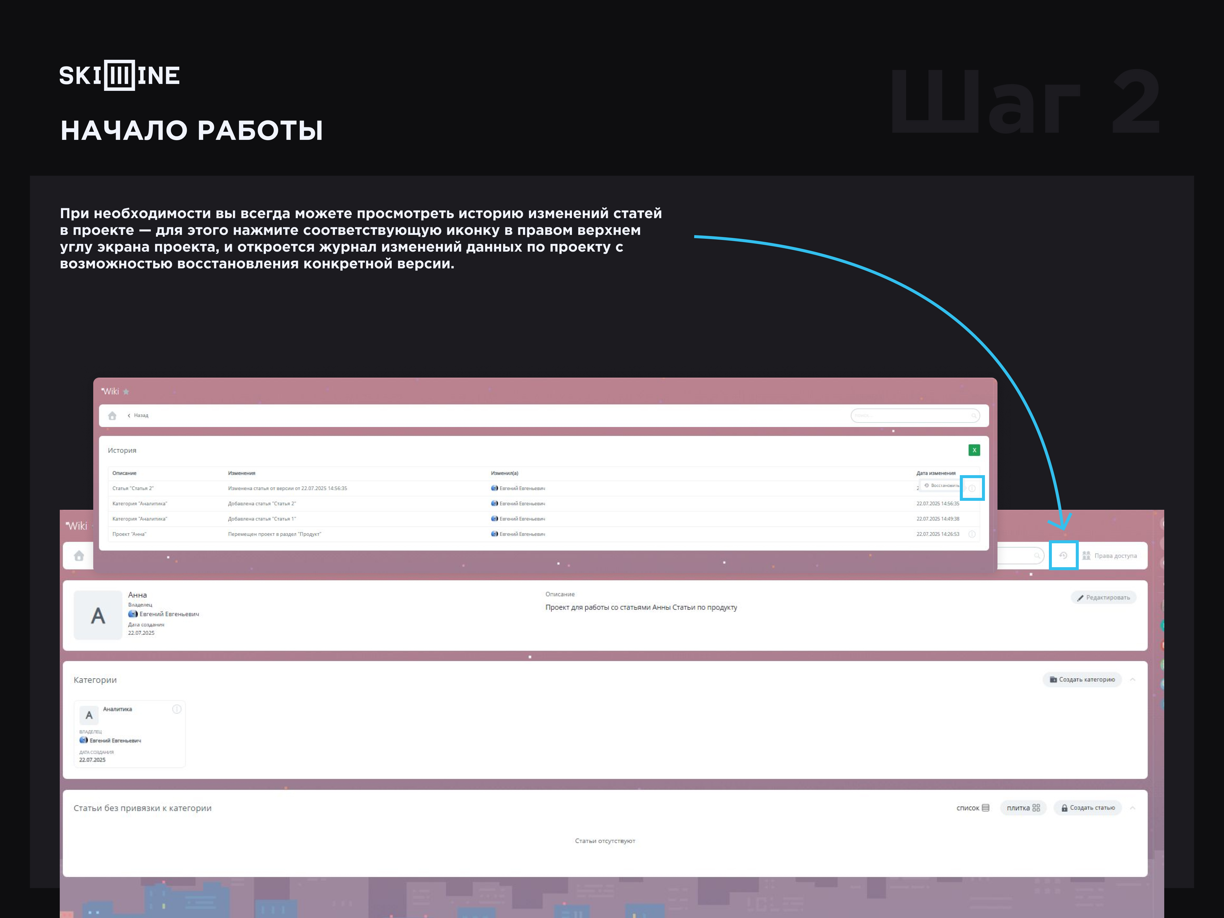 9. При необходимости вы всегда можете просмотреть историю изменений статей в проекте — для этого нажмите соответствующую иконку в правом верхнем углу экрана проекта, и откроется журнал изменений данных по проекту с возможностью восстановления конкретной версии.