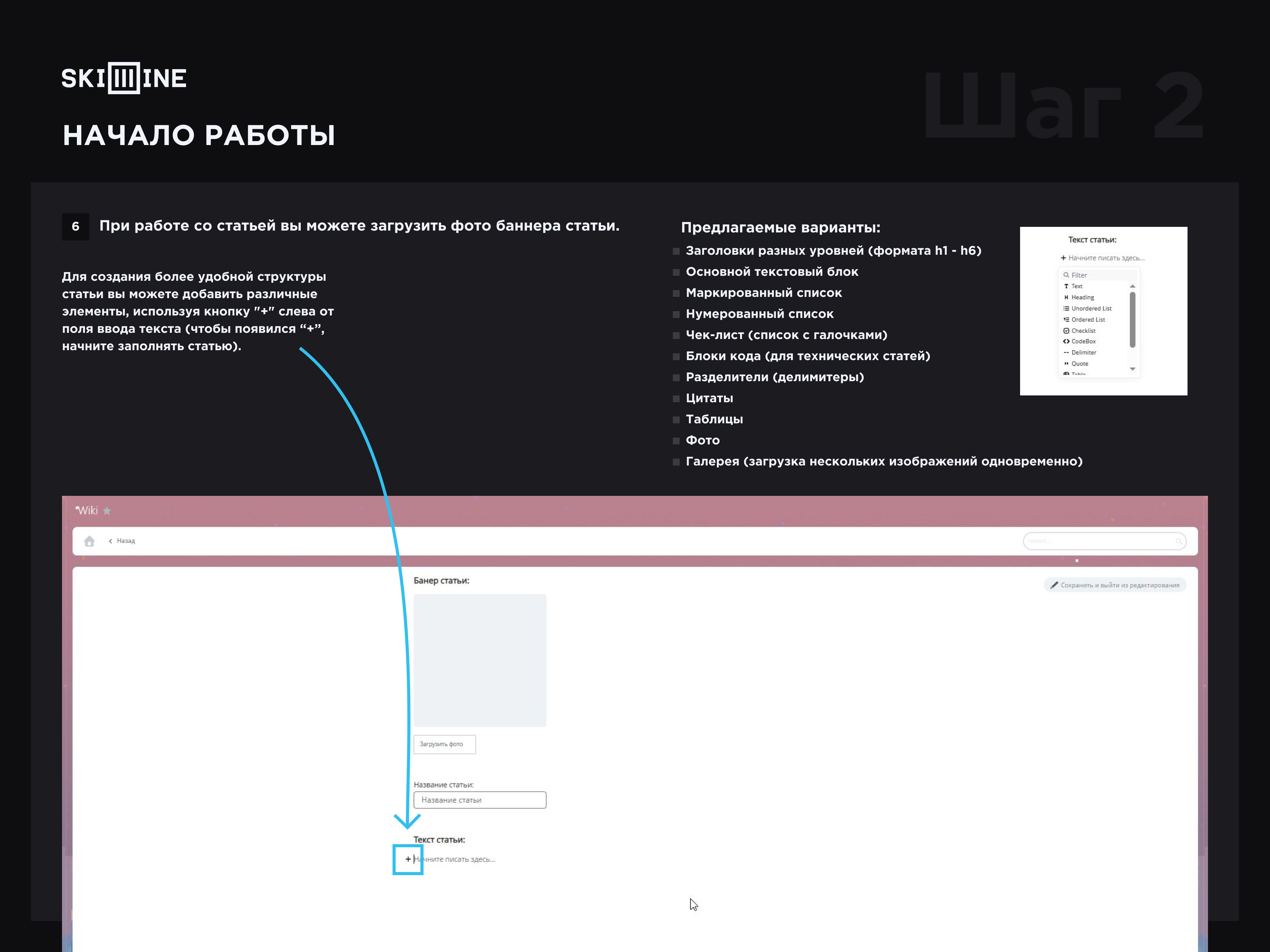 Для создания более удобной структуры статьи вы можете добавить различные элементы, используя кнопку "+" слева от поля ввода текста (чтобы появился “+”, начните заполнять статью). Предлагаемые варианты: