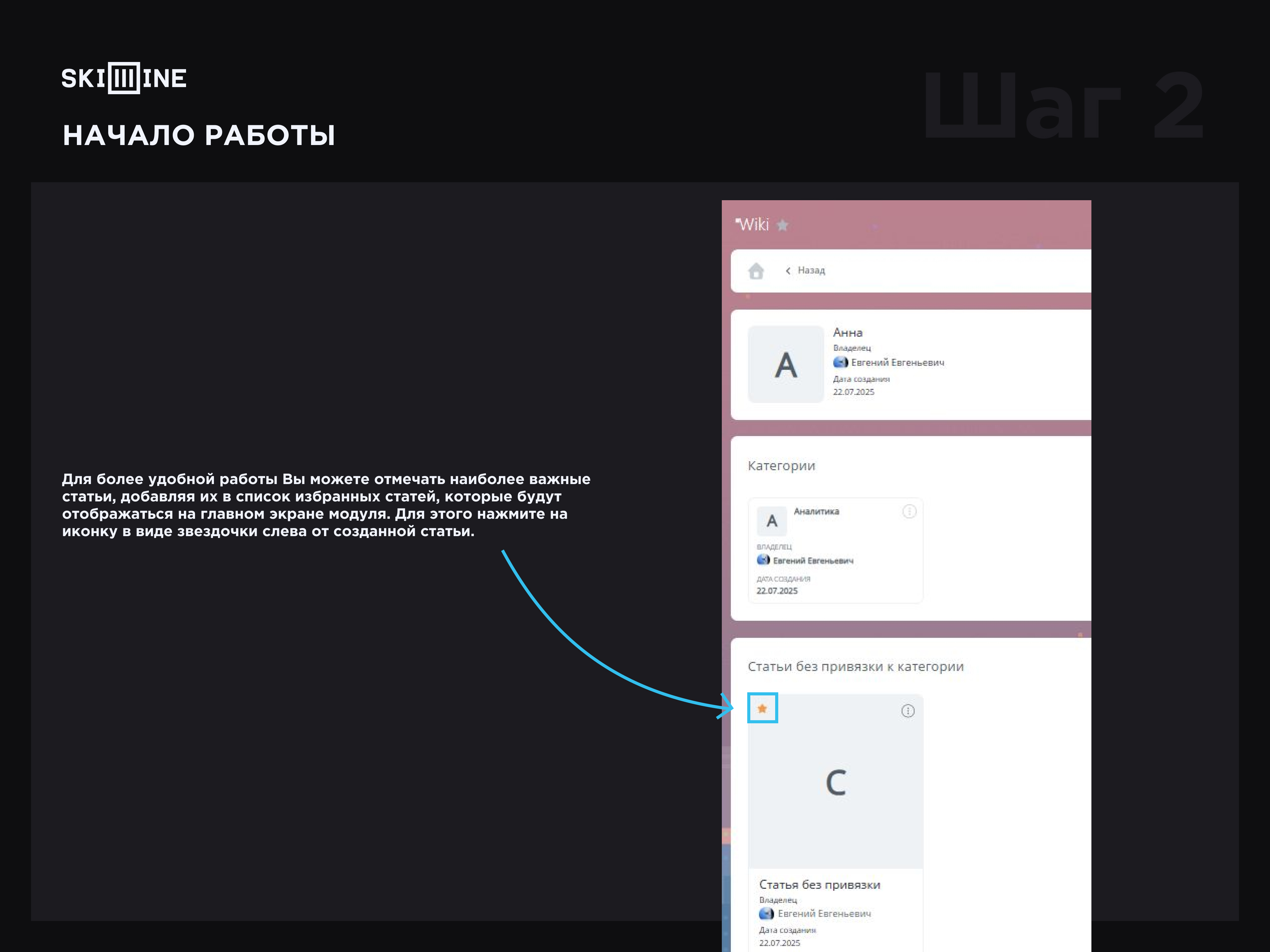 7. Для более удобной работы Вы можете отмечать наиболее важные статьи, добавляя их в список избранных статей, которые будут отображаться на главном экране модуля. Для этого нажмите на иконку в виде звездочки слева от созданной статьи.