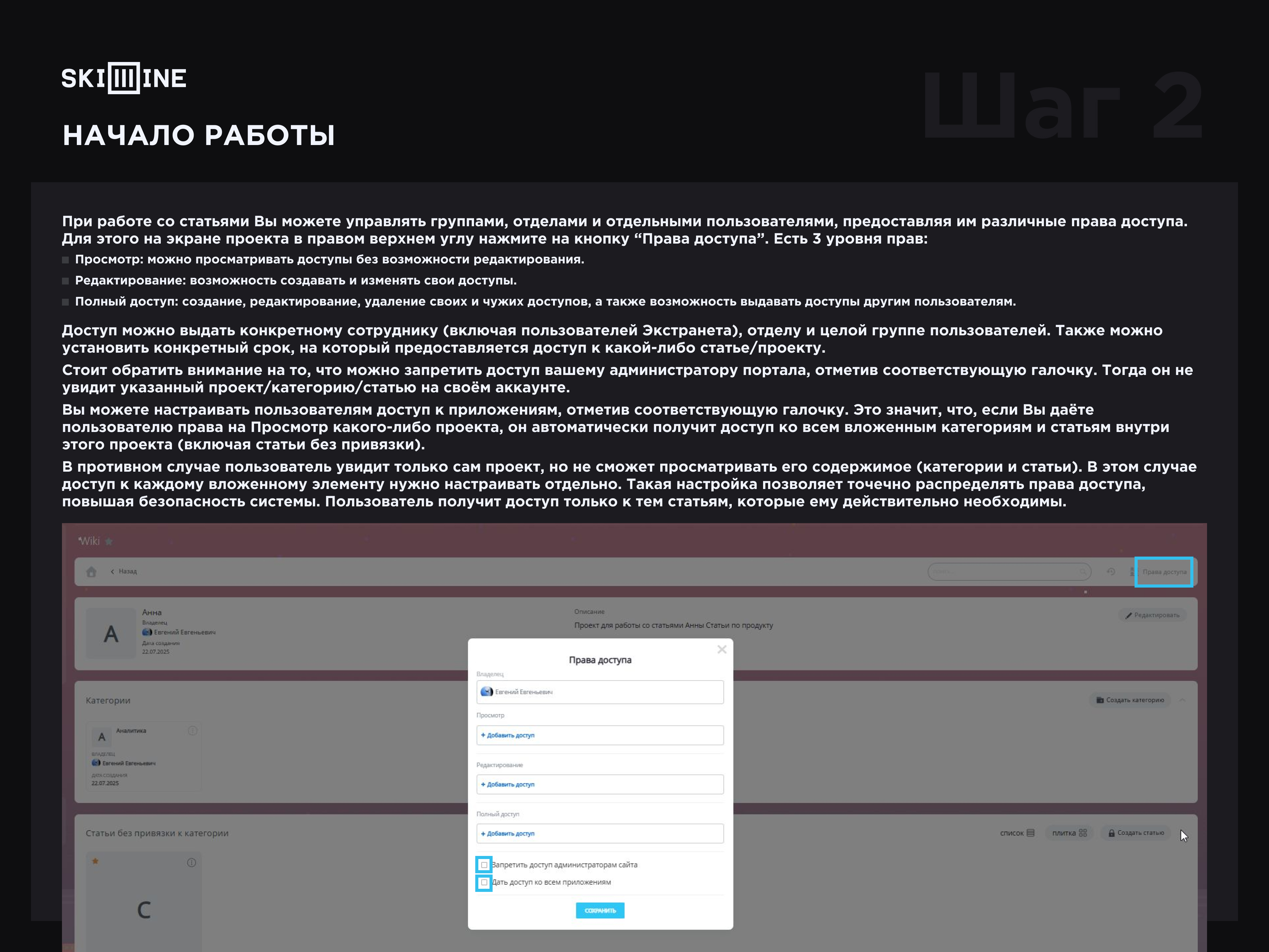 Вы можете настраивать пользователям доступ к приложениям, отметив соответствующую галочку. Это значит, что, если Вы даёте пользователю права на Просмотр какого-либо проекта, он автоматически получит доступ ко всем вложенным категориям и статьям внутри этого проекта (включая статьи без привязки).