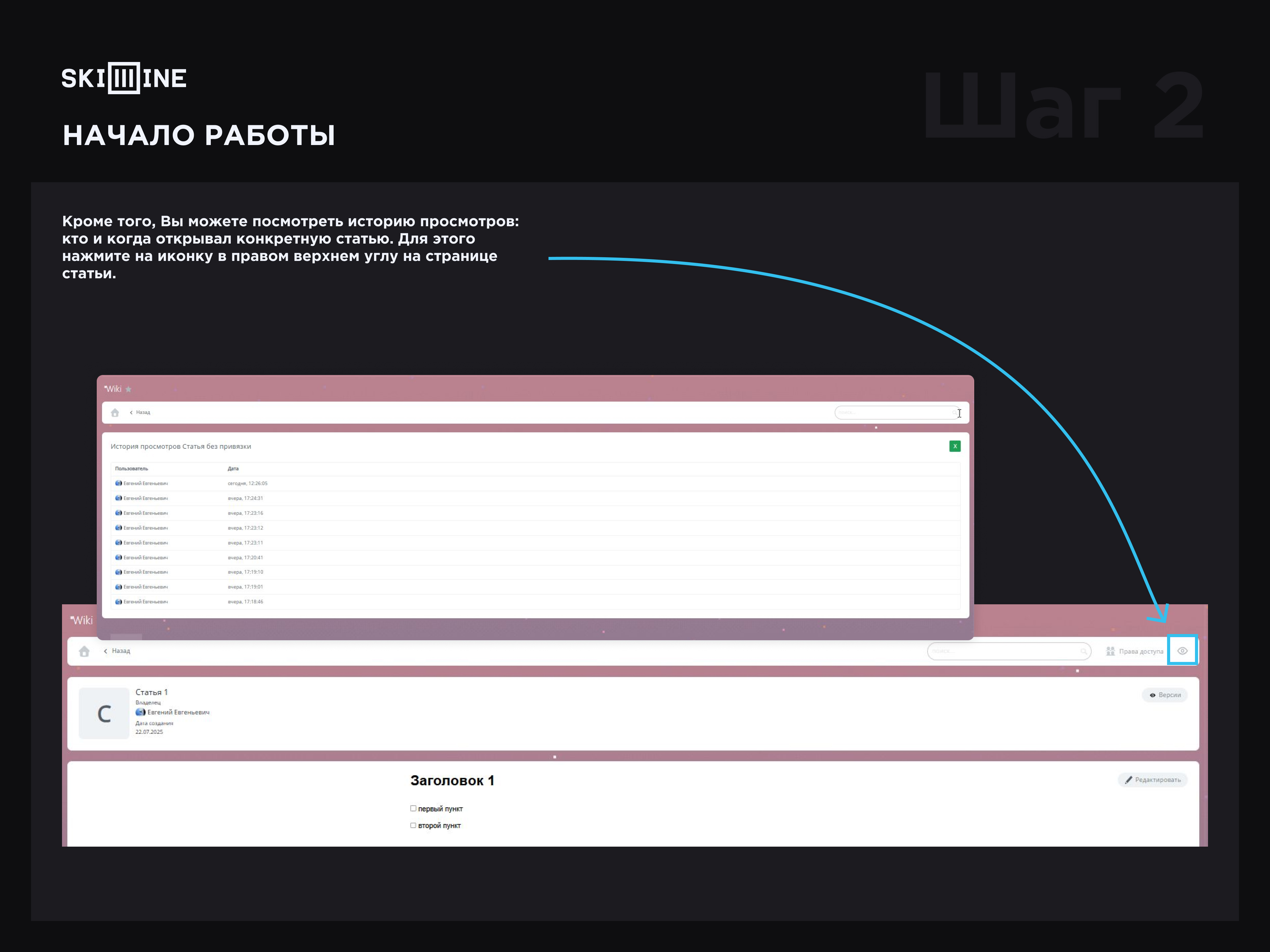 10. Кроме того, Вы можете посмотреть историю просмотров: кто и когда открывал конкретную статью. Для этого нажмите на иконку в правом верхнем углу на странице статьи.