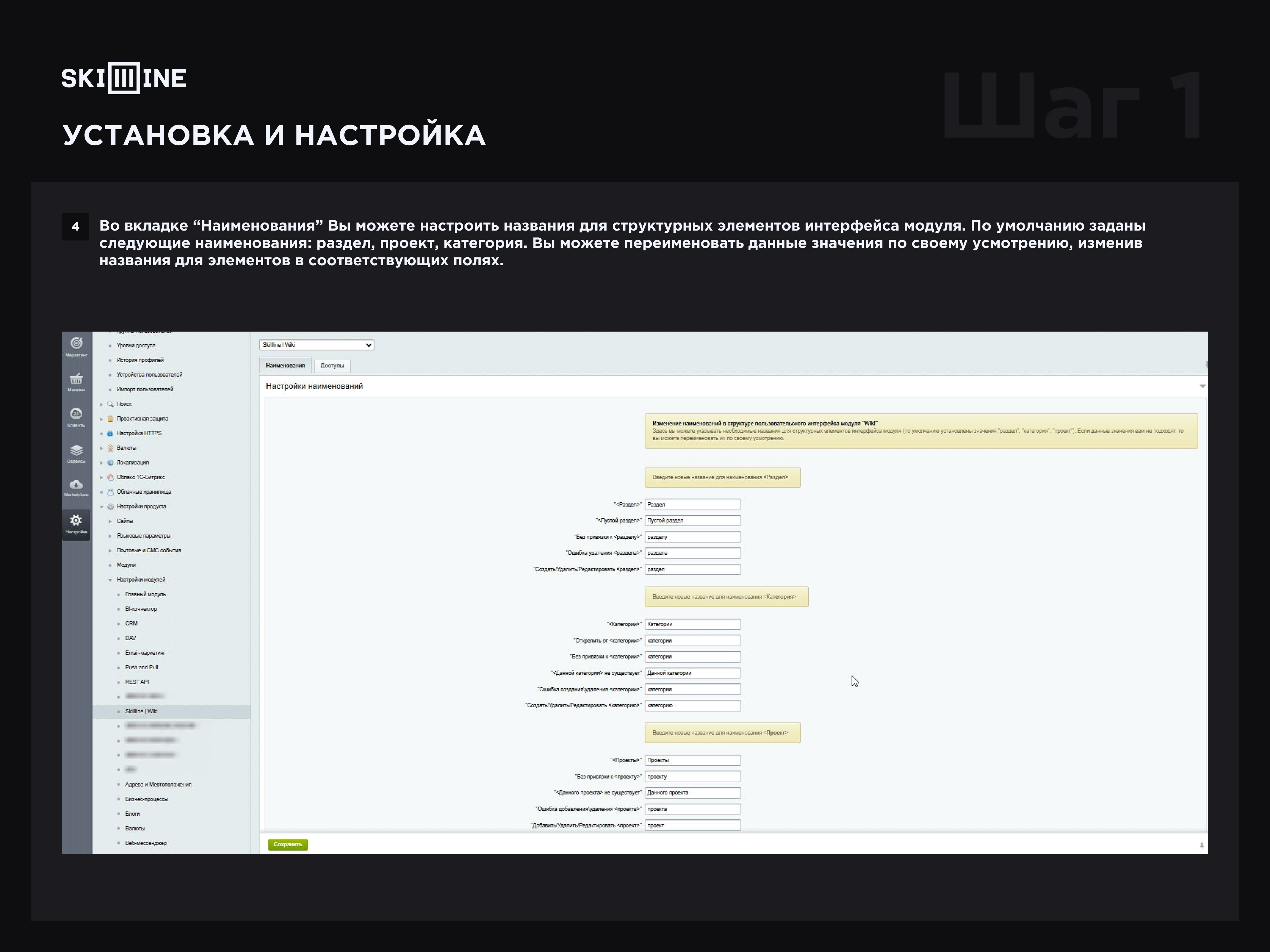 3. После завершения установки Вы можете перейти в раздел "Настройки" , выбрать подпункт "Настройки модулей” > “Skillline | Wiki” и начать настройку установленного модуля.