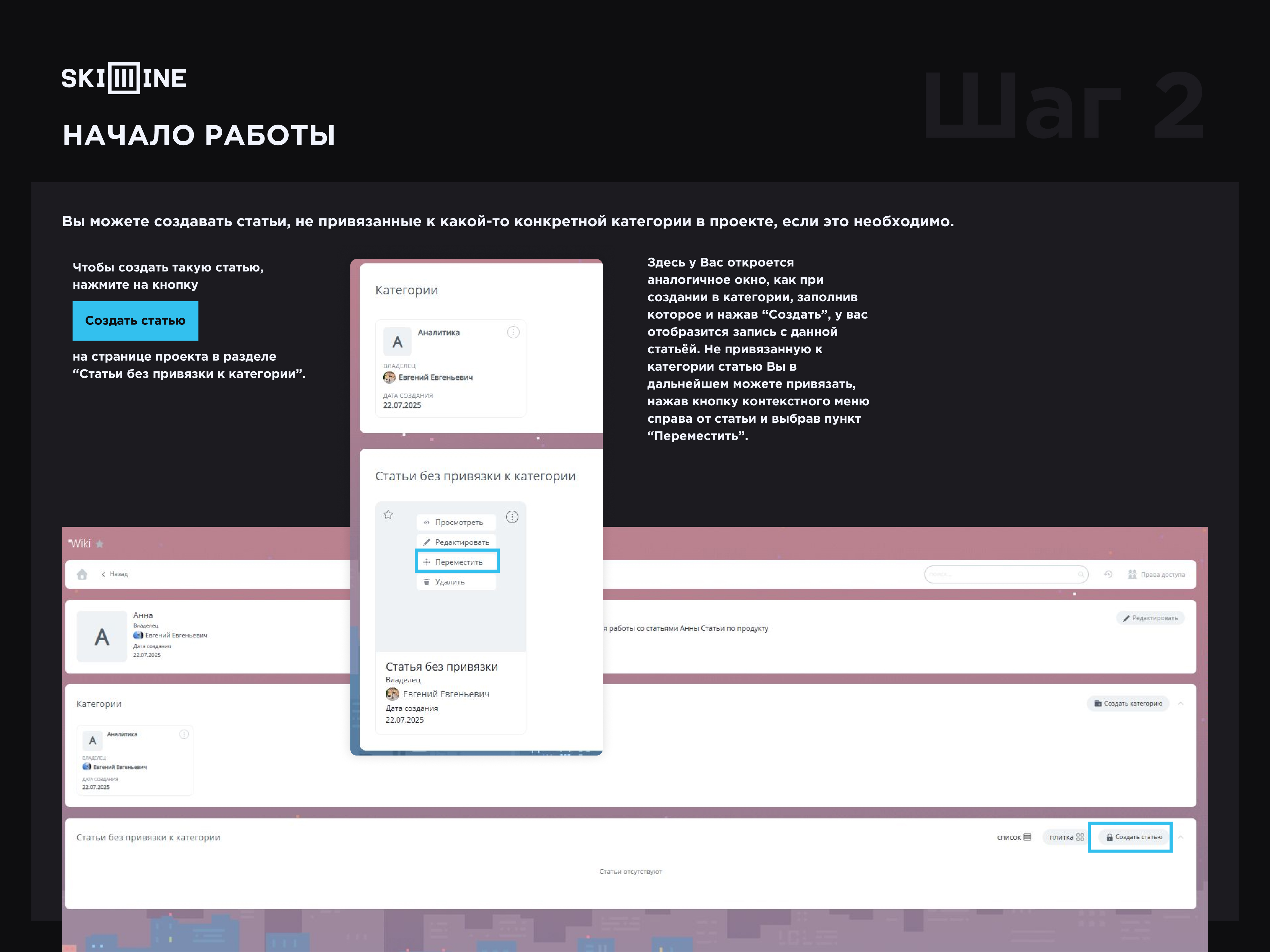Здесь у Вас откроется аналогичное окно, как при создании в категории, заполнив которое и нажав “Создать”, у вас отобразится запись с данной статьёй. Не привязанную к категории статью Вы в дальнейшем можете привязать, нажав кнопку контекстного меню справа от статьи и выбрав пункт “Переместить”.