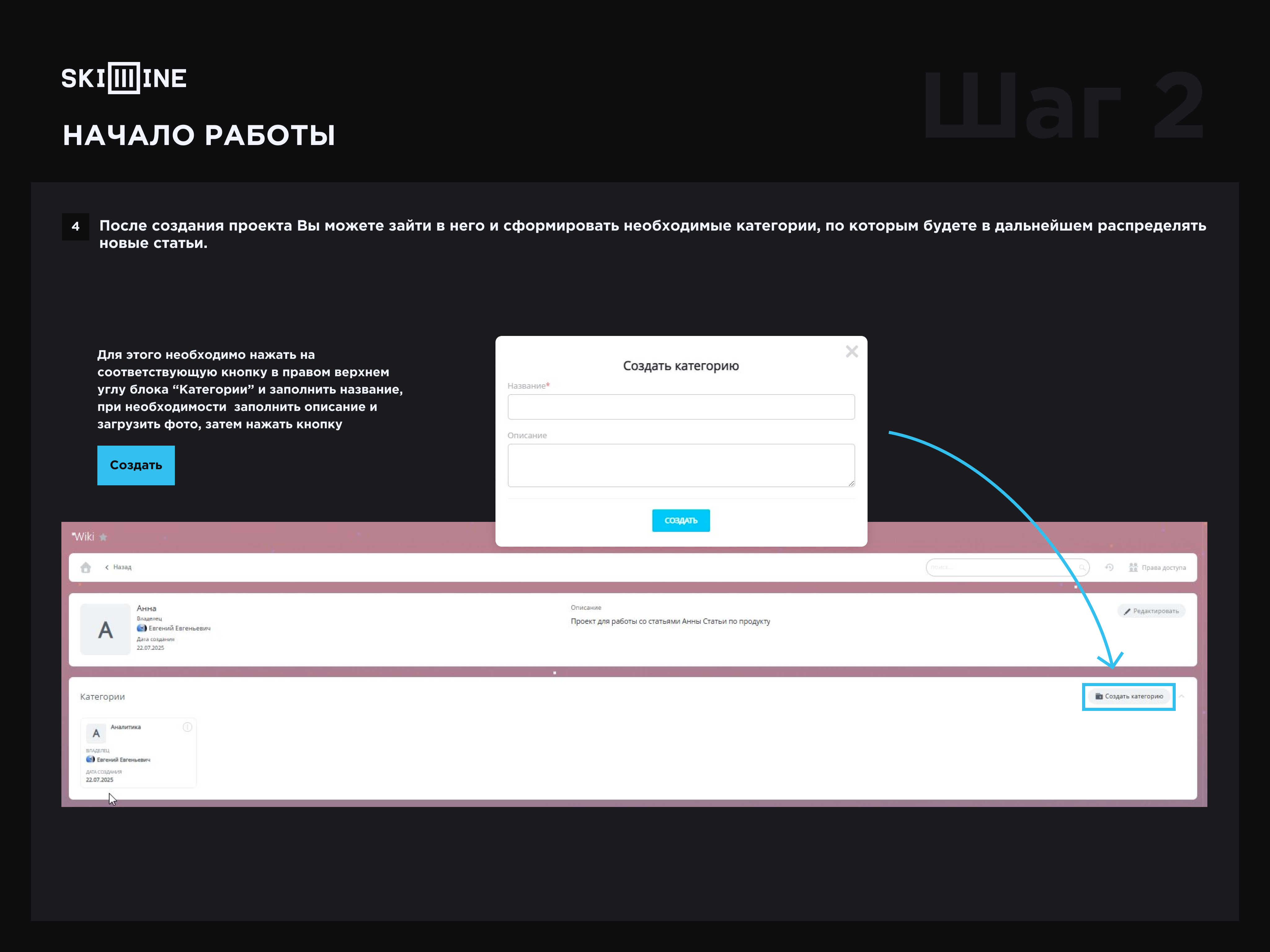 4. После создания проекта Вы можете зайти в него и сформировать необходимые категории, по которым будете в дальнейшем распределять новые статьи. Для этого необходимо нажать на соответствующую кнопку в правом верхнем углу блока “Категории” и заполнить название, при необходимости заполнить описание и загрузить фото, затем нажать кнопку “Создать”.