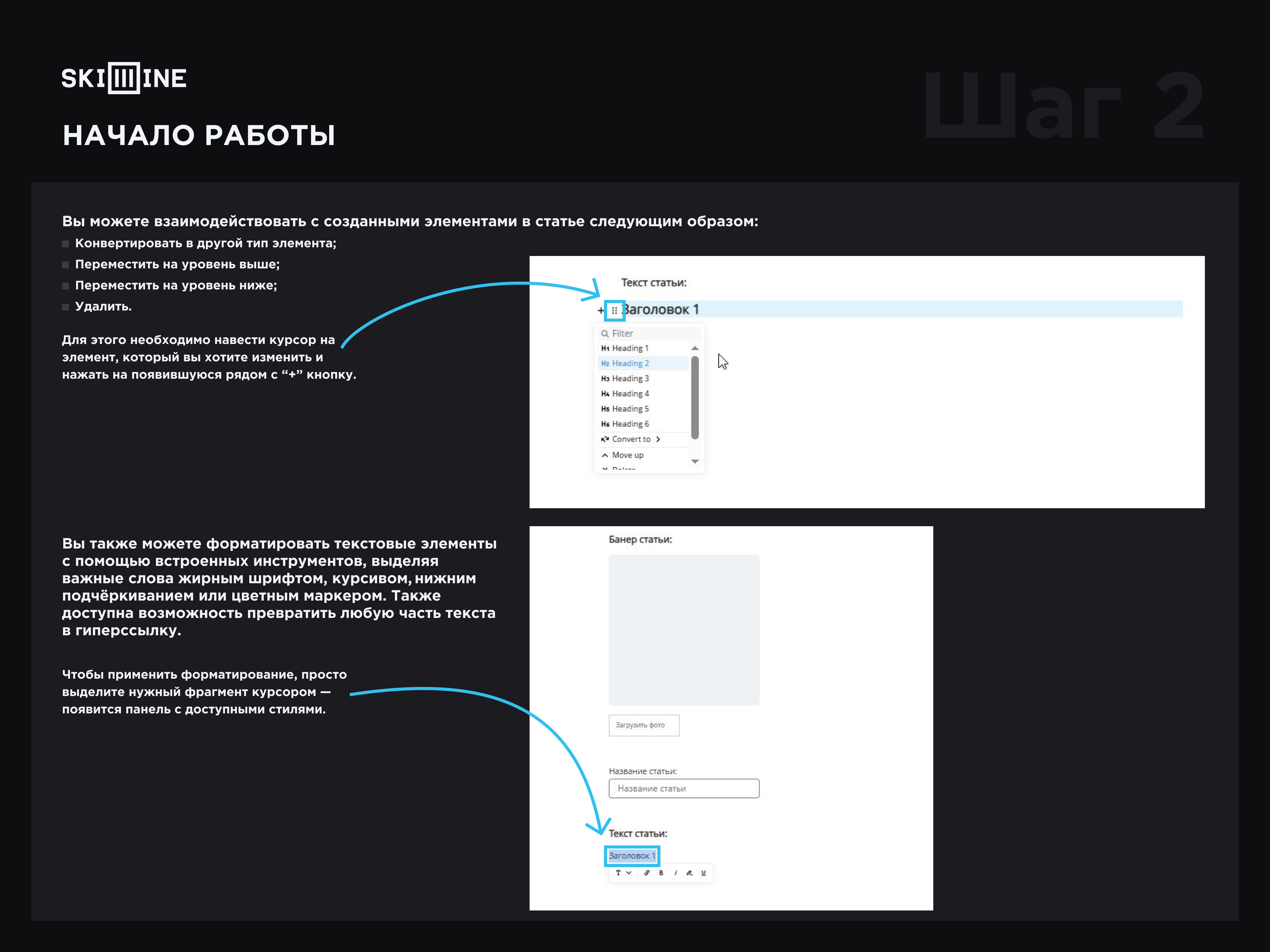 Вы можете форматировать текстовые элементы с помощью встроенных инструментов, выделяя важные слова жирным шрифтом, курсивом, нижним подчёркиванием или цветным маркером. Также доступна возможность превратить любую часть текста в гиперссылку.