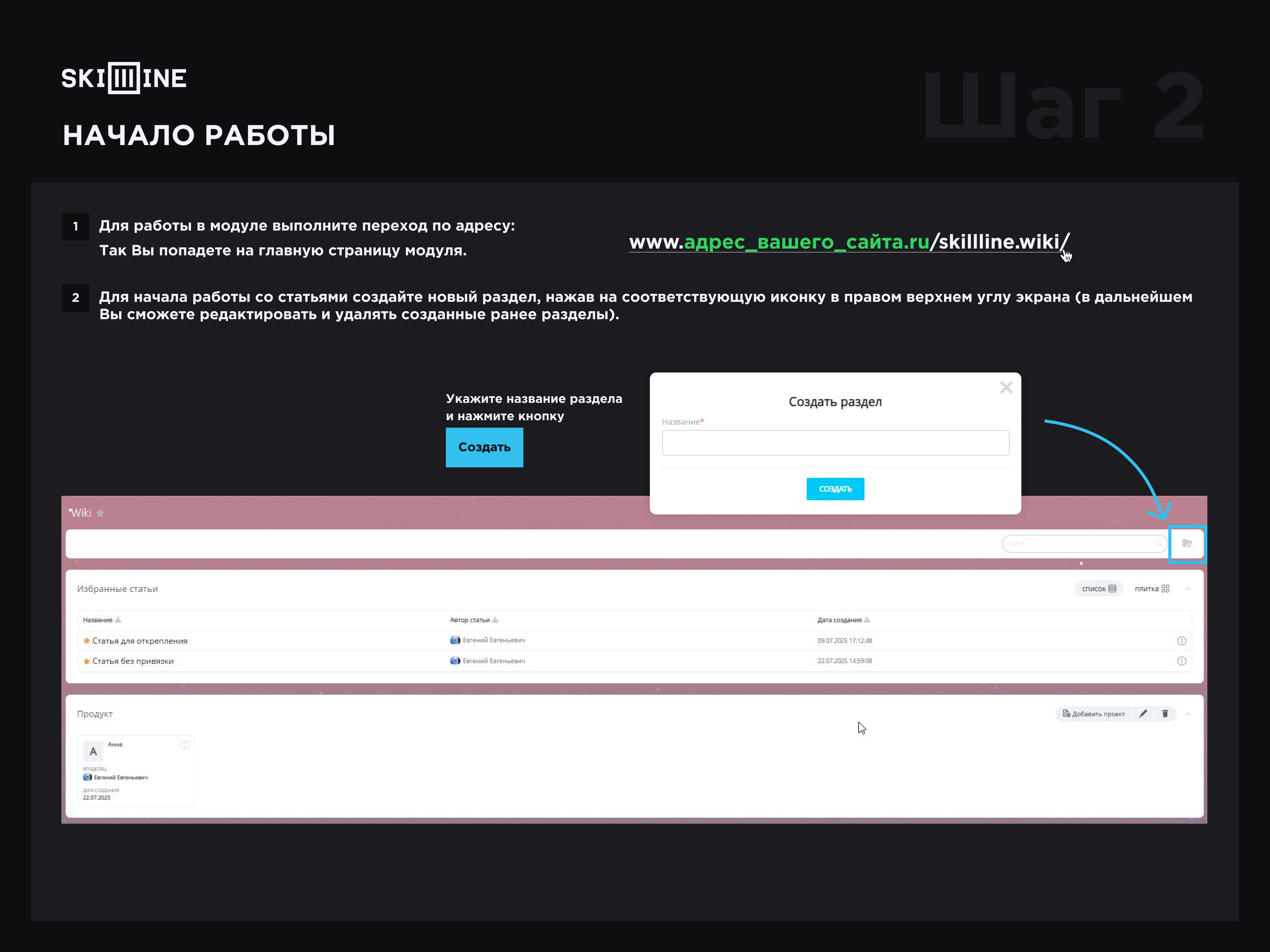 После выполнения всех пунктов установки, модуль будет доступен по ссылке: www.адрес_вашего _сайта.ru/skillline.wiki/