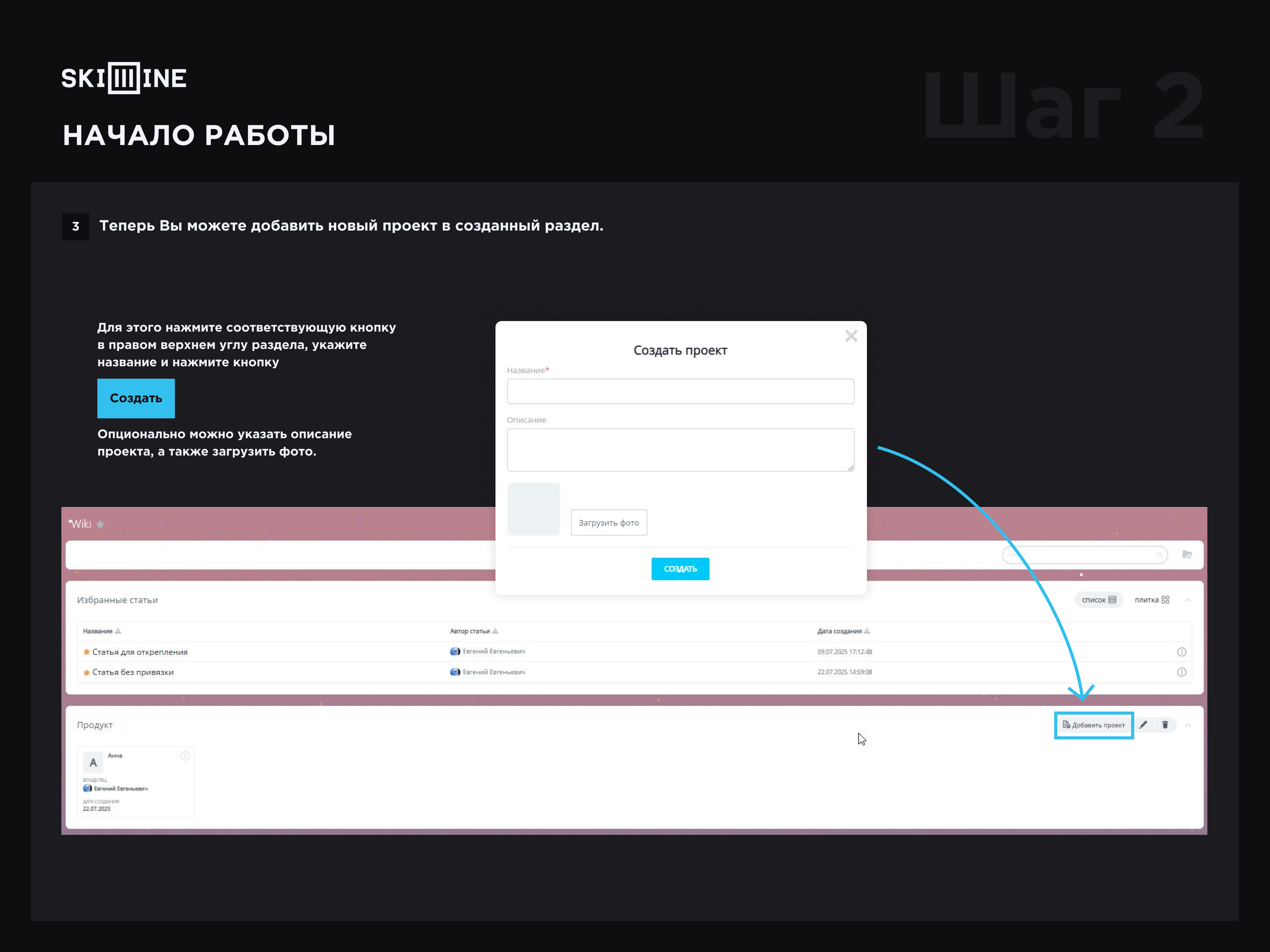 3. Теперь Вы можете добавить новый проект в созданный раздел. Для этого нажмите соответствующую кнопку в правом верхнем углу раздела, укажите название и нажмите кнопку “Создать”. Опционально можно указать описание проекта, а также загрузить фото.